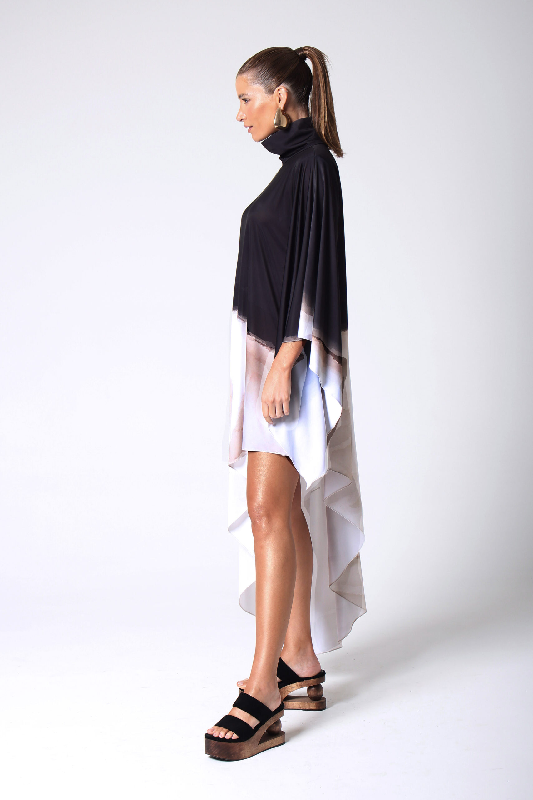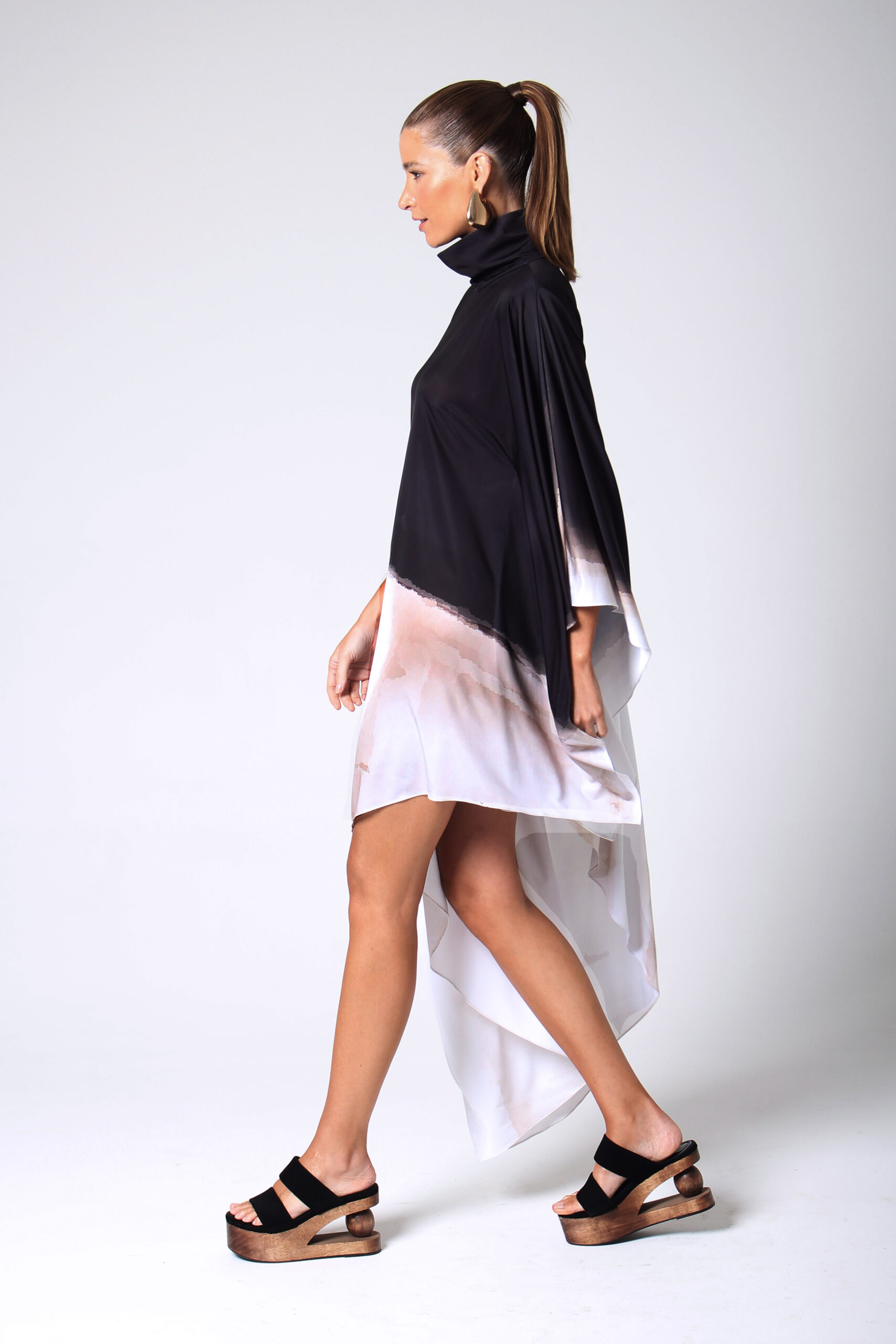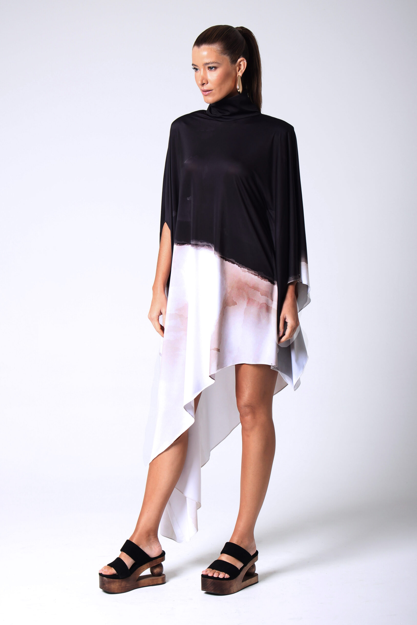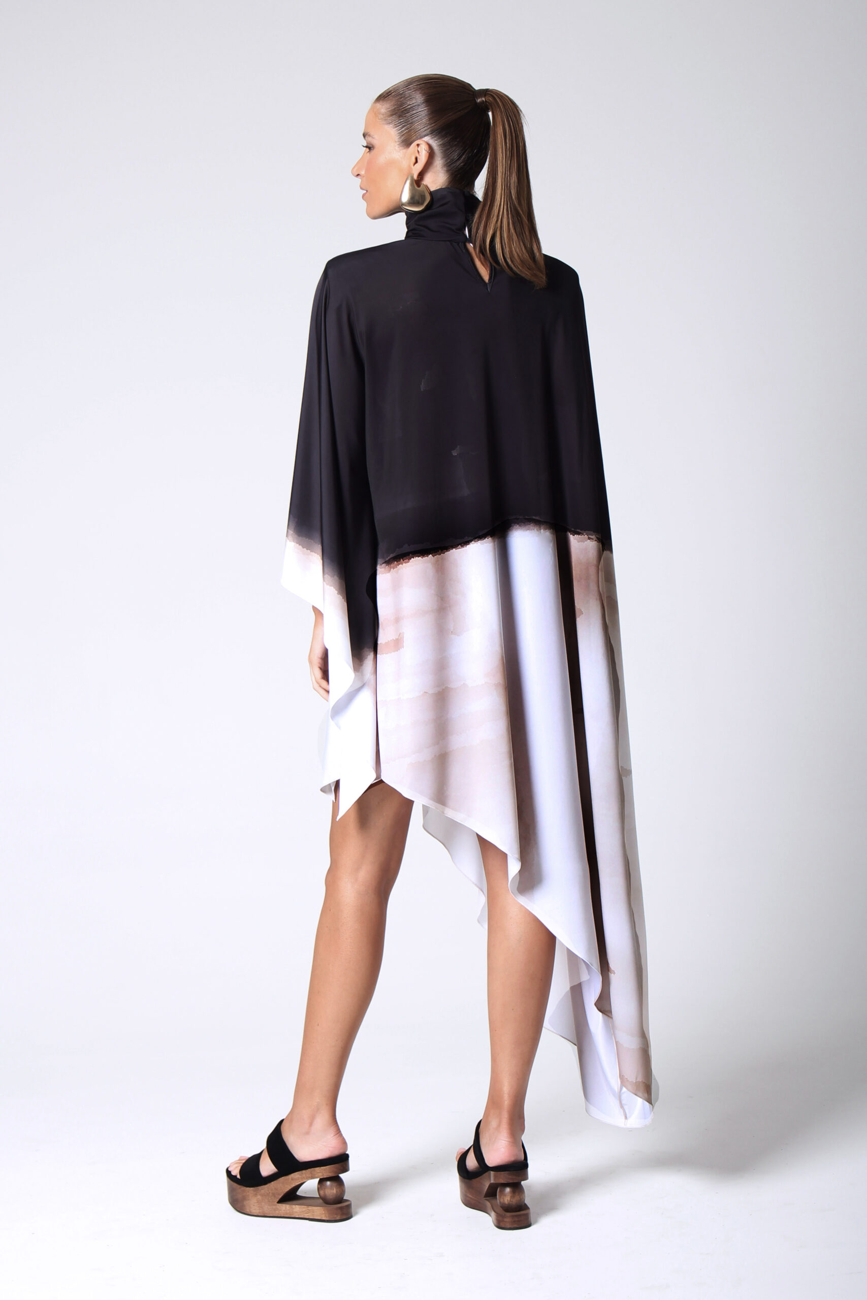 VESTIDO NUMBER ASSIMÉTRICO, GOLA ALTA COM BOTÕES ENCAPADOS.