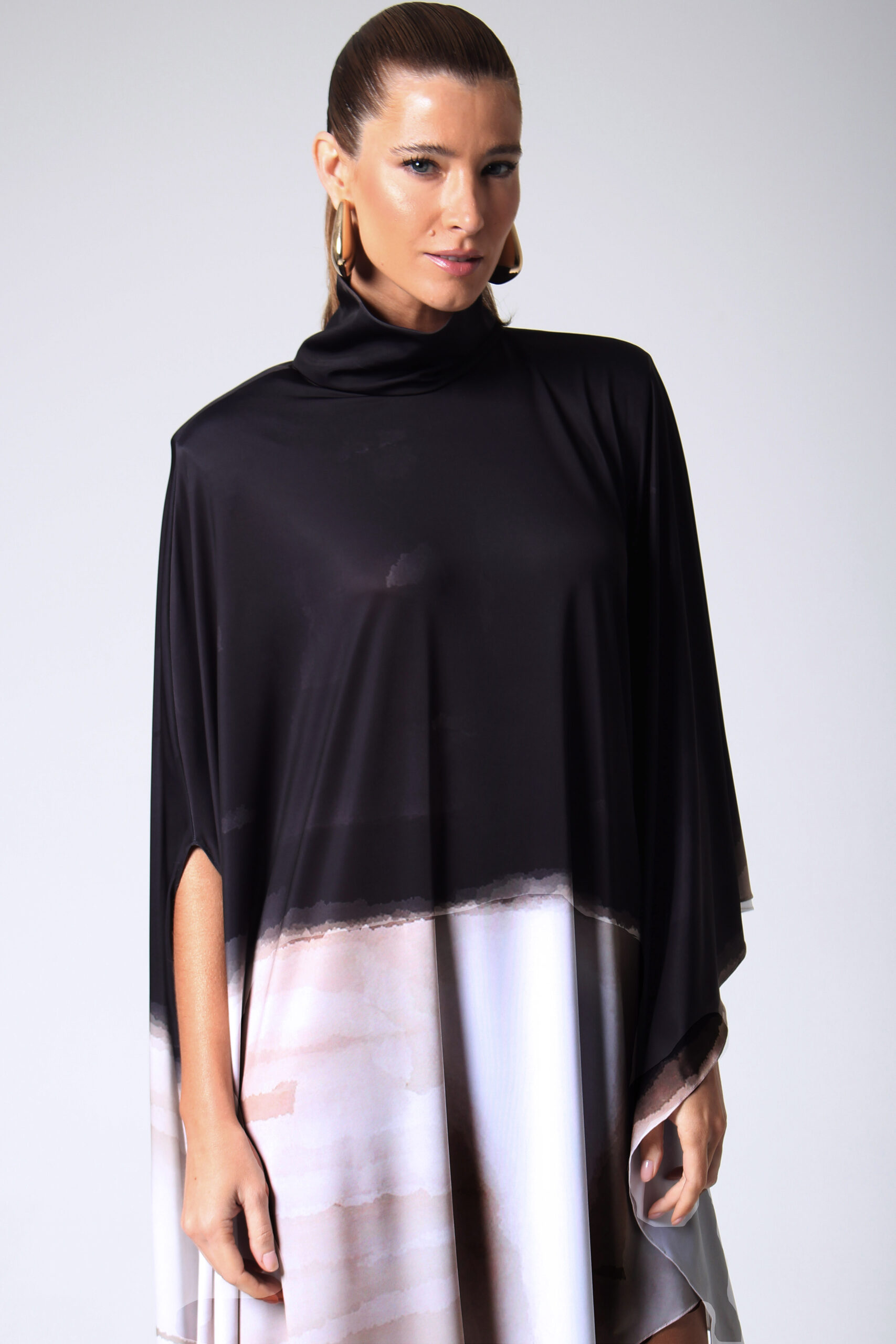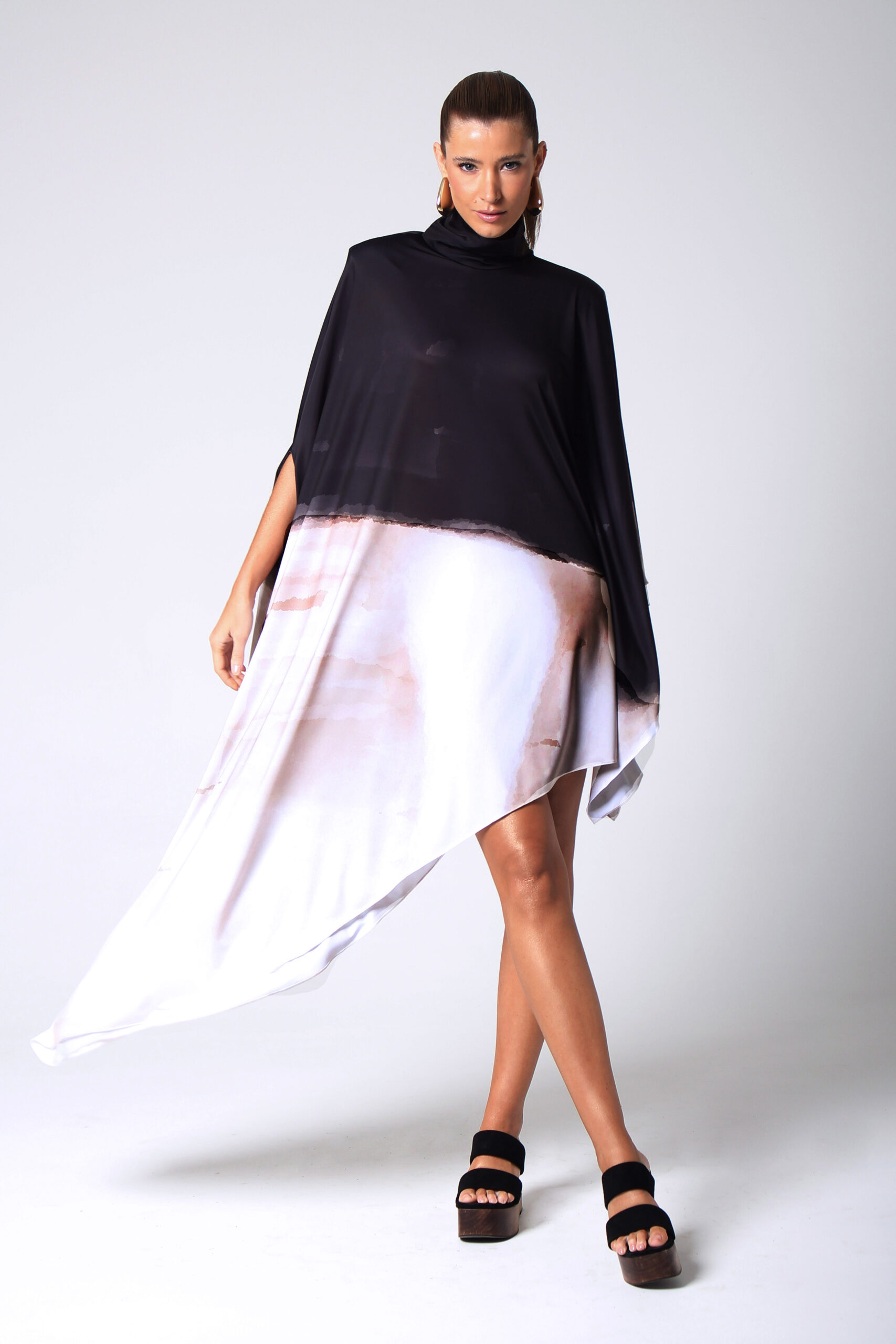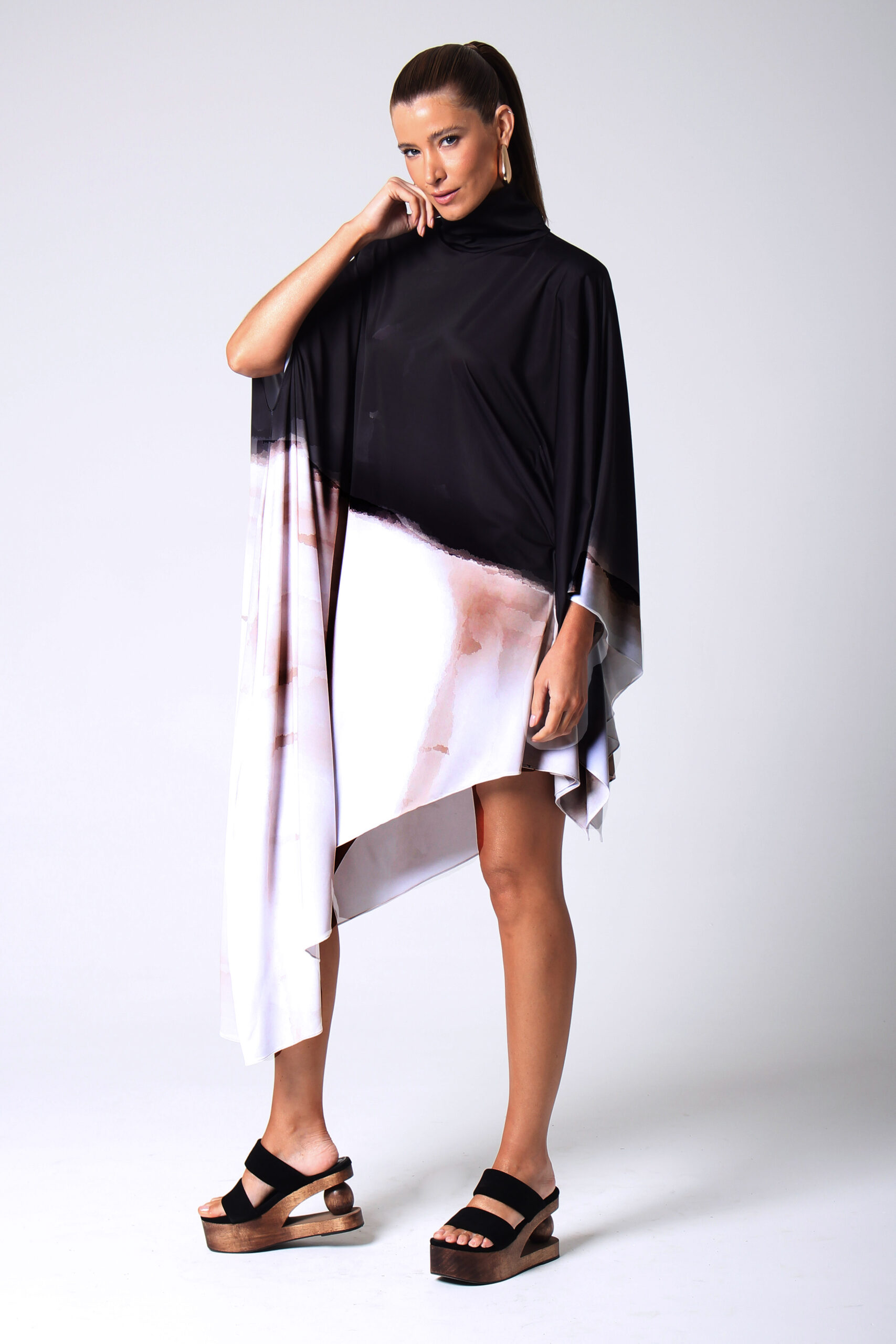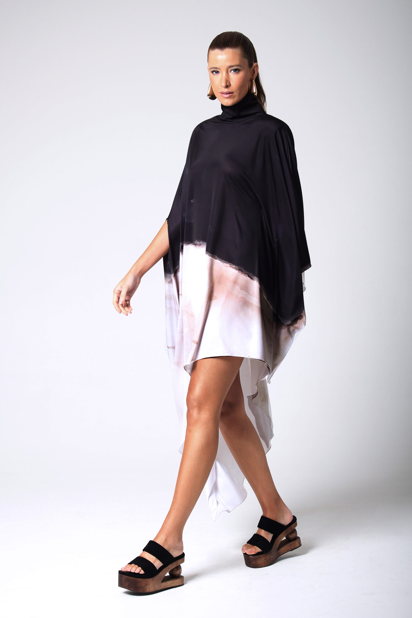 VESTIDO NUMBER ASSIMÉTRICO, GOLA ALTA COM BOTÕES ENCAPADOS.