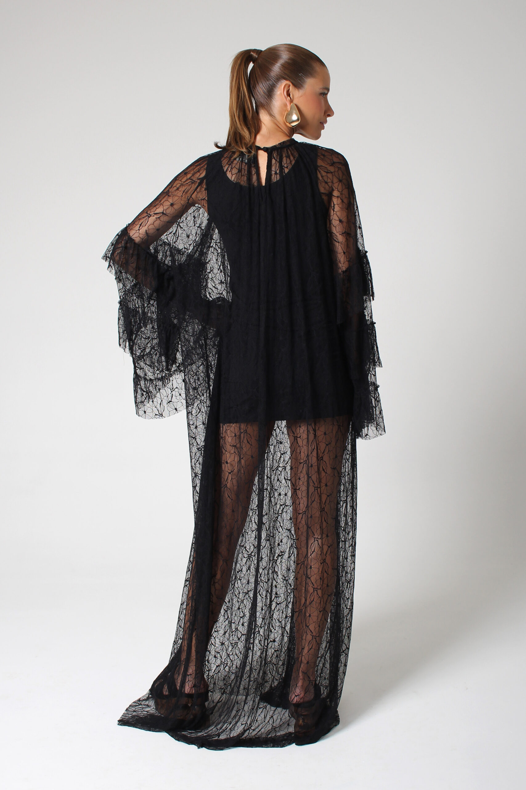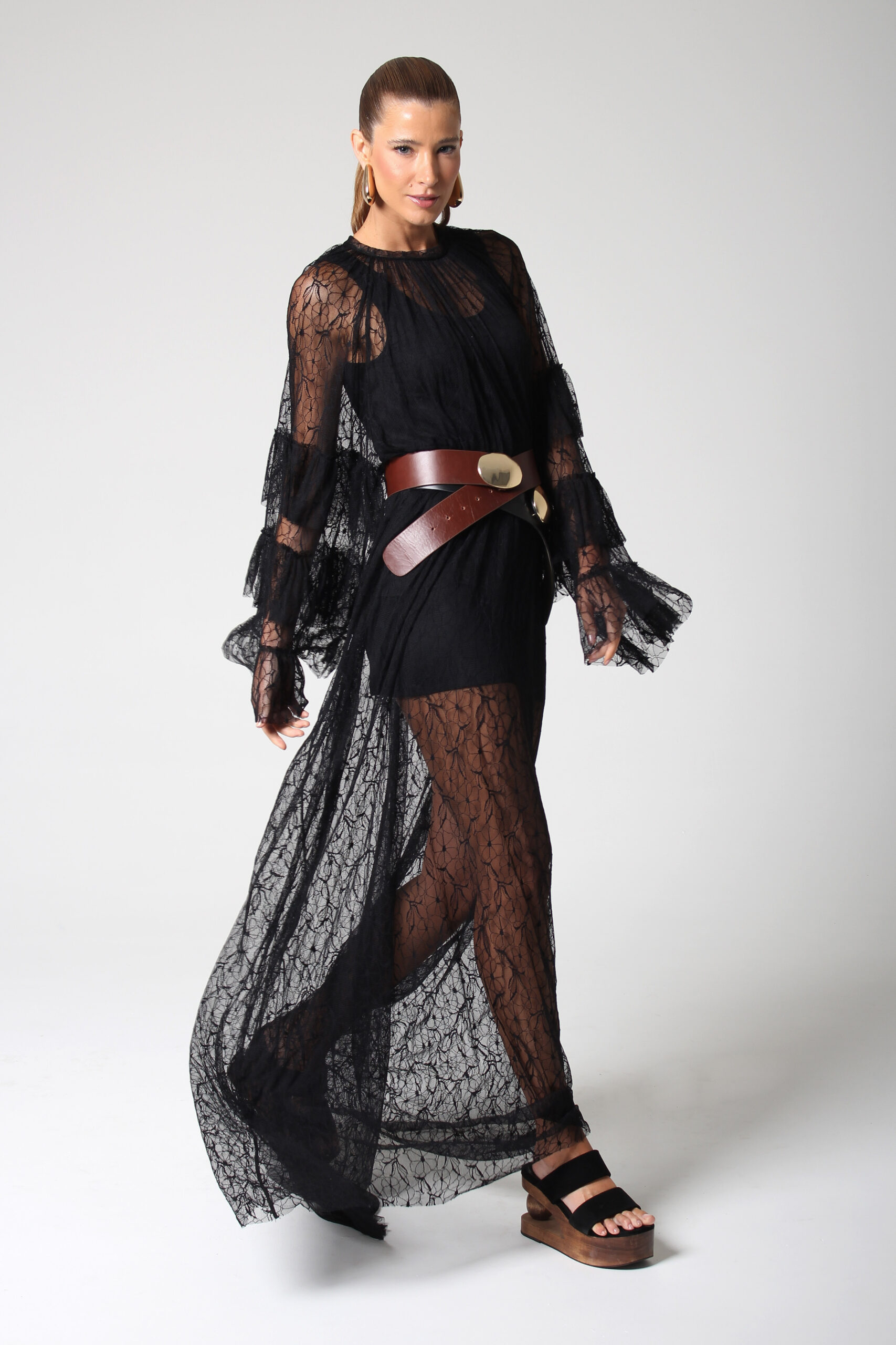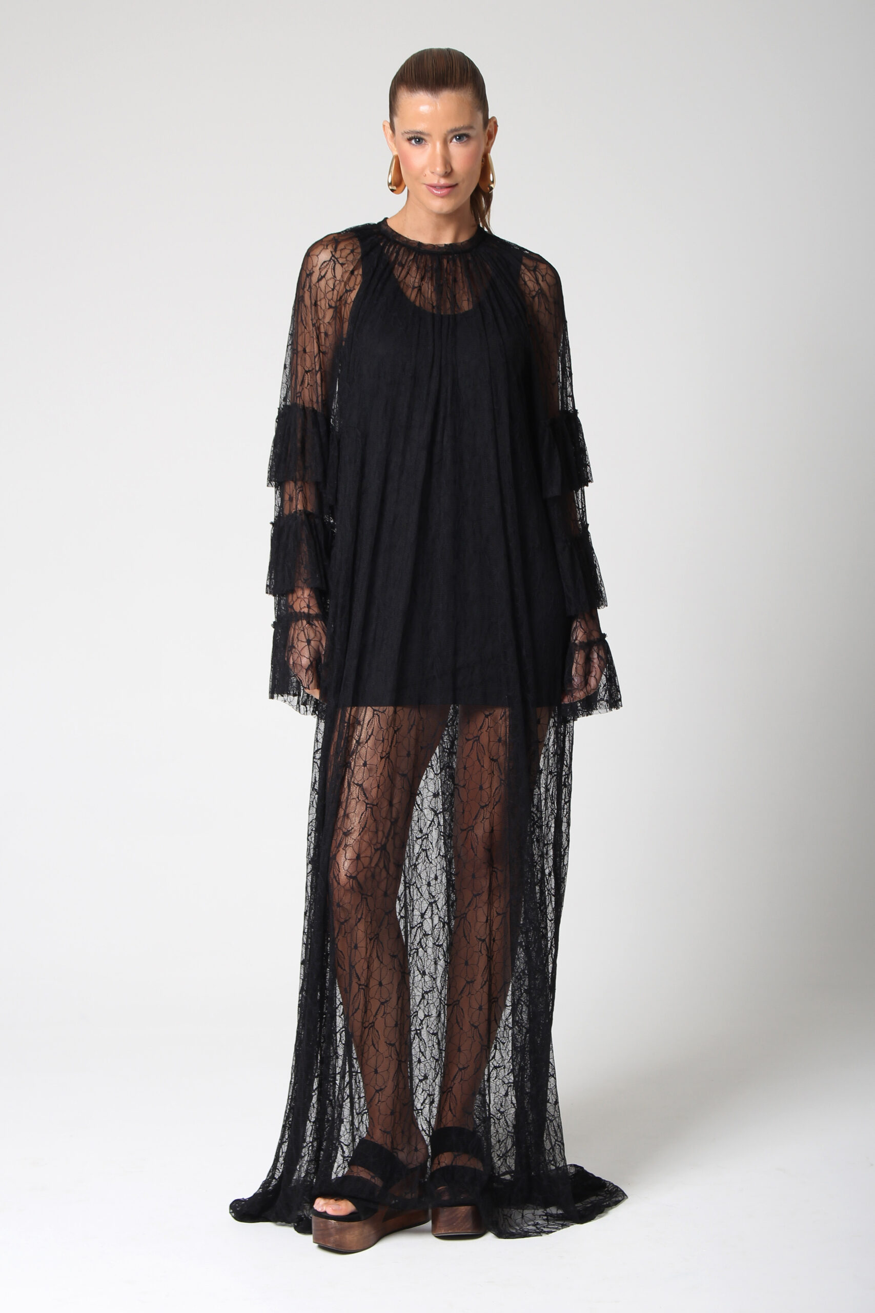 VESTIDO PÁSSAROS LONGO, COM BABADOS NA MANGA, COLA CANOA COM FECHAMENTO EM BOTÃO ENCAPADO.