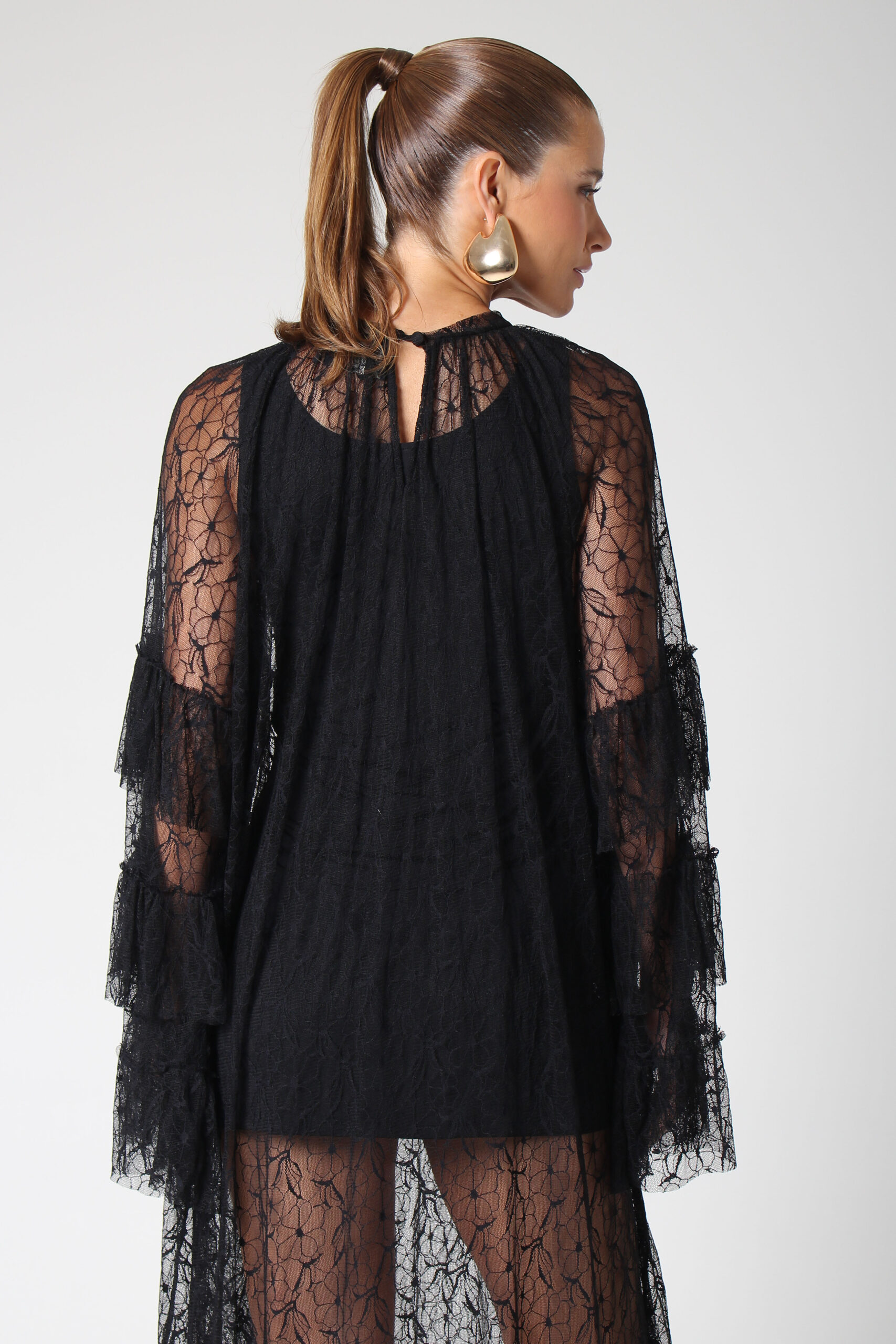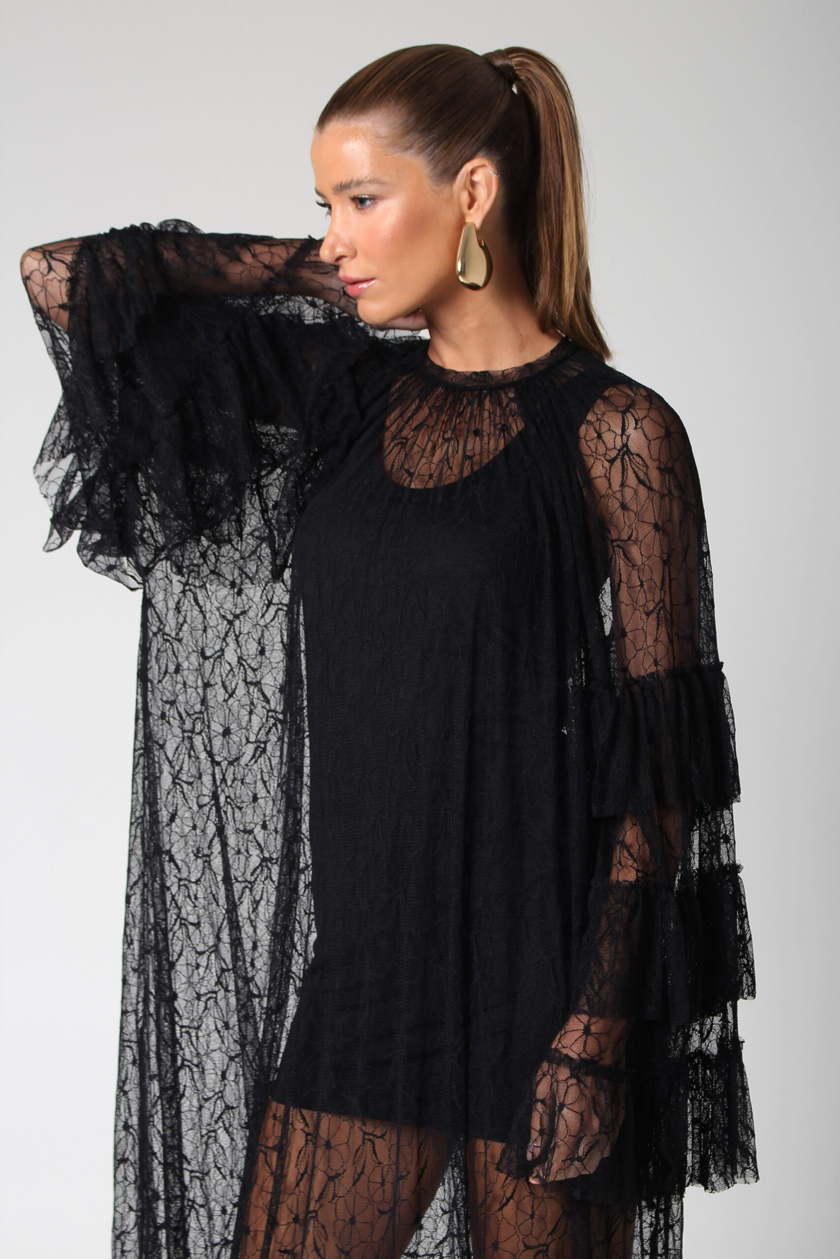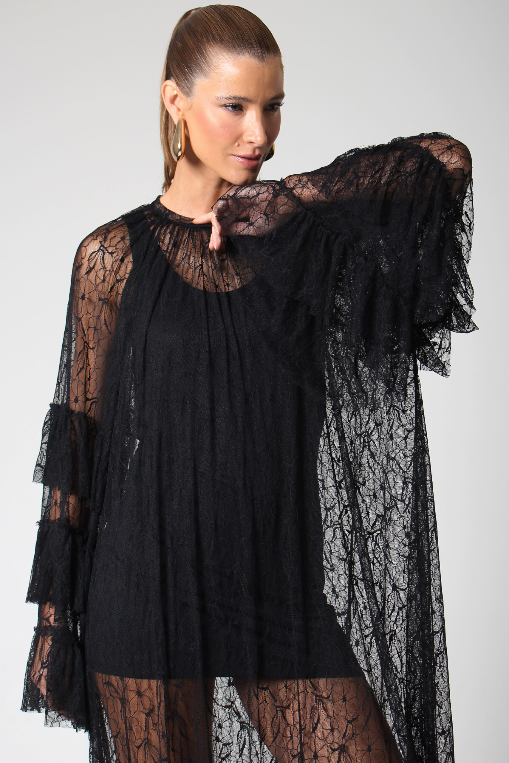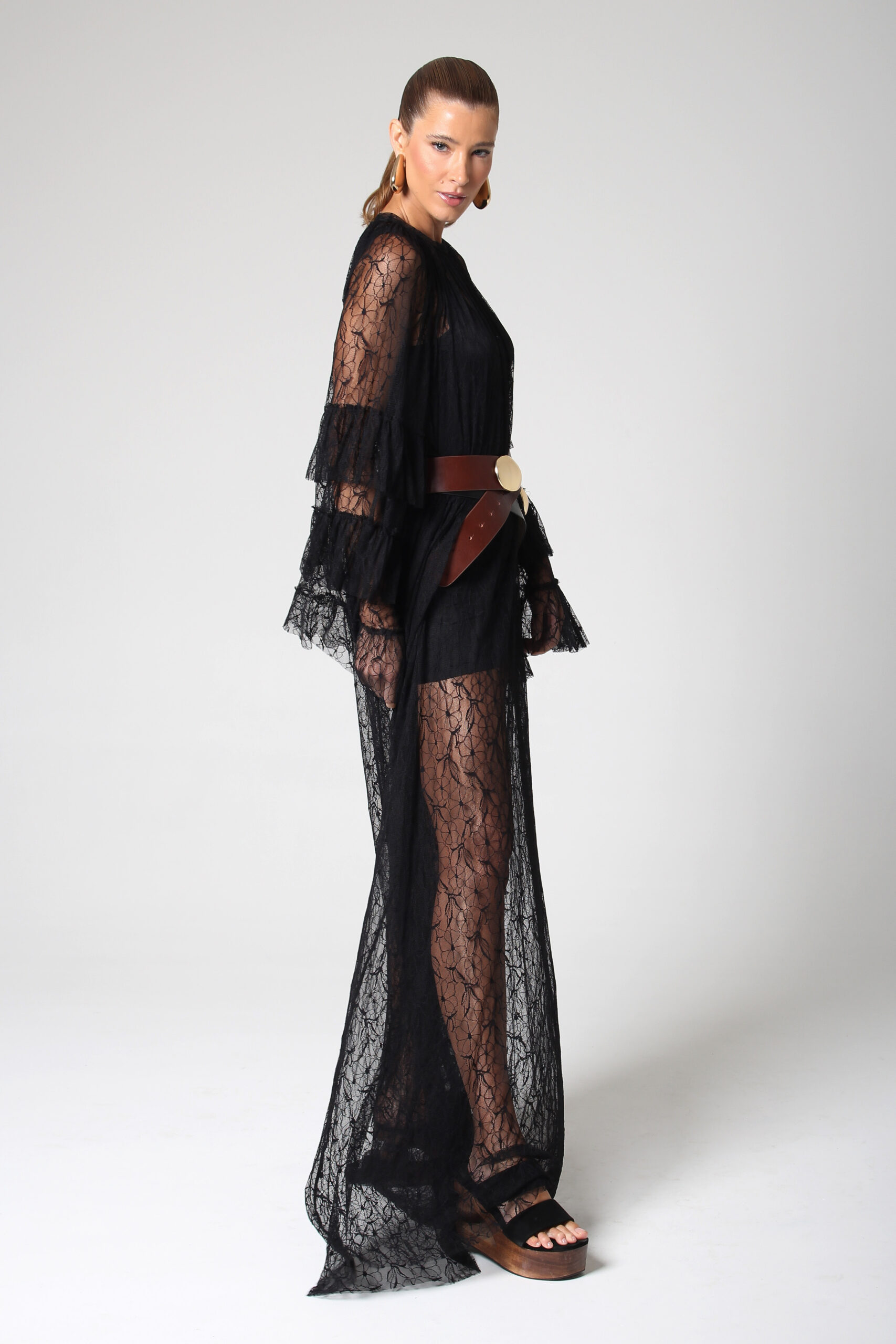 VESTIDO PÁSSAROS LONGO, COM BABADOS NA MANGA, COLA CANOA COM FECHAMENTO EM BOTÃO ENCAPADO.